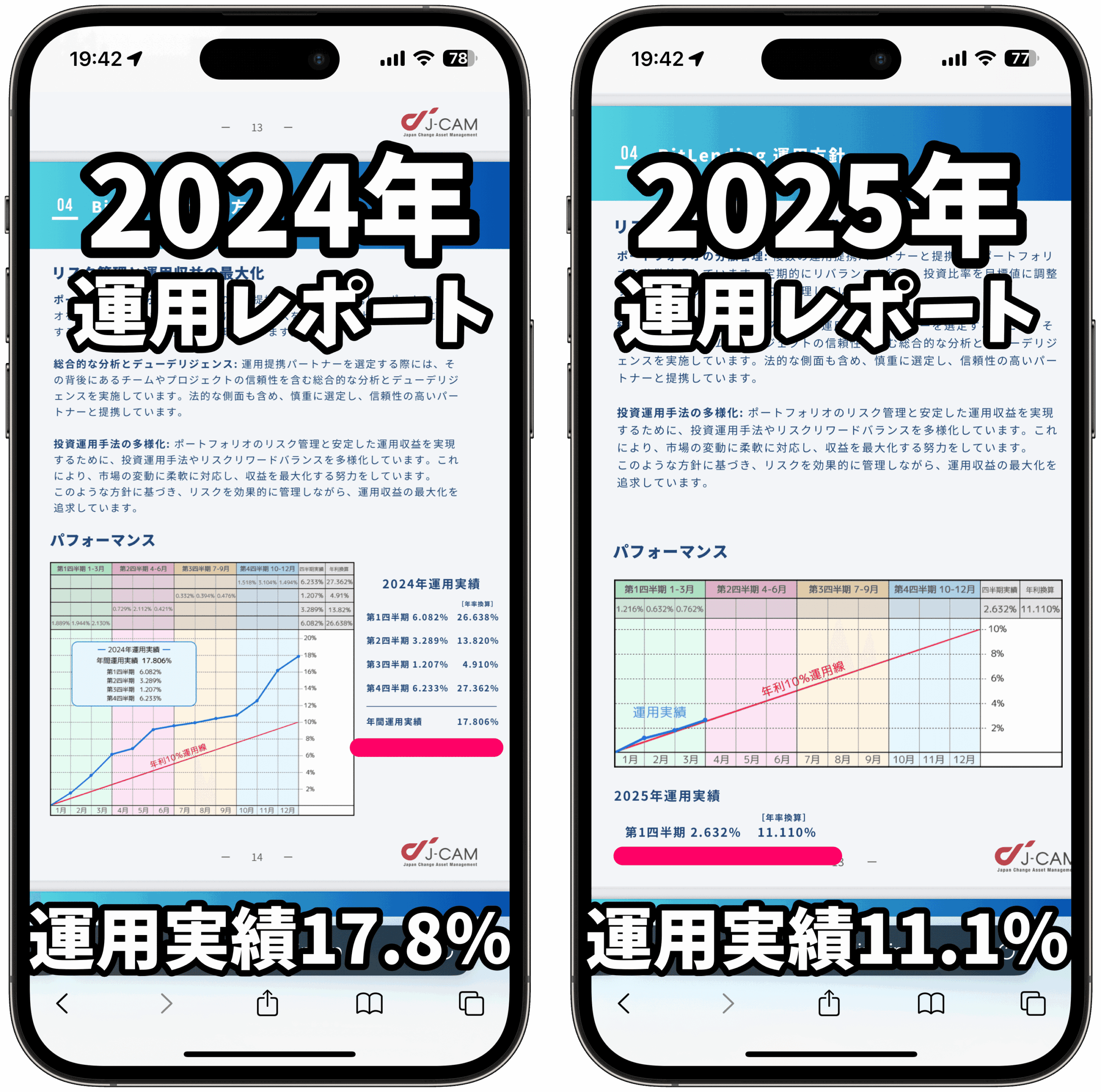ビットレンディングが登録者向けに限定公開している運用レポート(2024年10-12月期と2025年1-3月期のレポートを参照)によると、2024年はビットコイン価格の高騰の影響もあり、年間運用実績は驚異の17.8%。